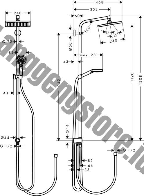 - consists of: overhead shower, hand shower, shower hose, slider, wall connector