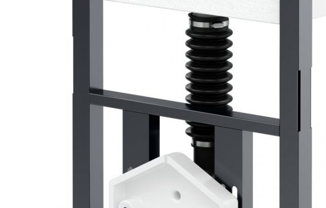 powder-​coated frame (40×40), crossbeam height-​adjustable by quick release (holder with measuring tape for alignment), sound protected urinal flushing system installation set, urinal connection fitting, fixing material, extensible lockable feet for height adjustment, water connection R½