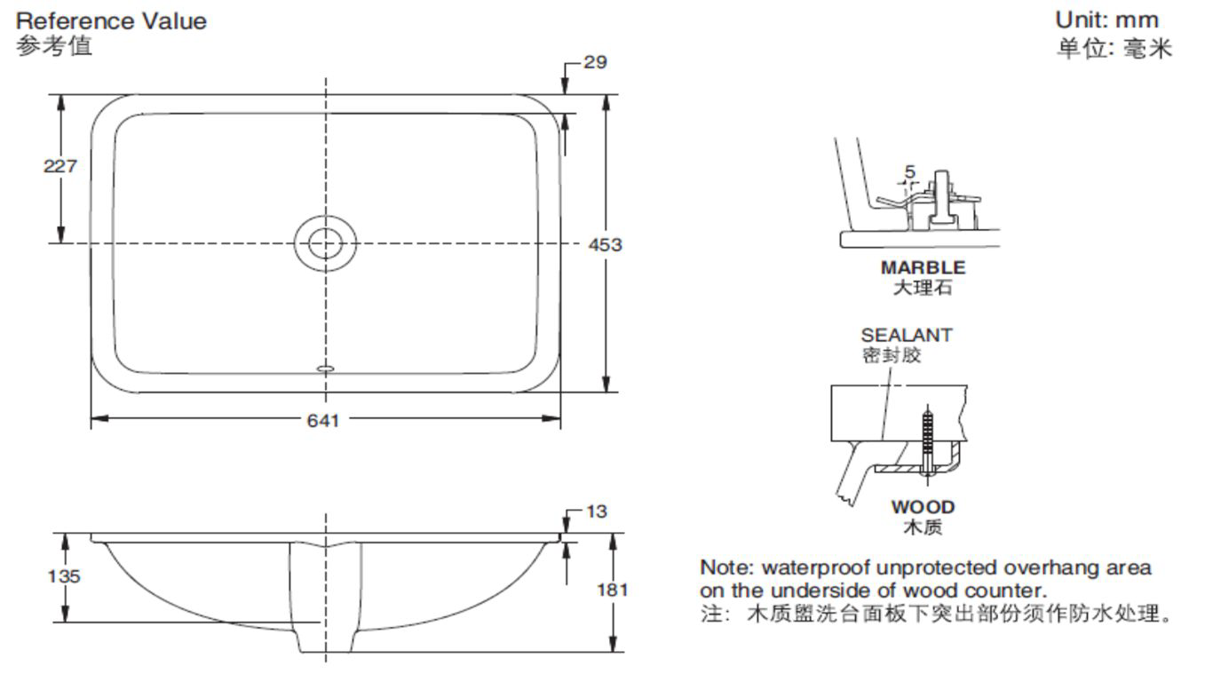 Product description : Caxton® Rectangular Under-counter Lavatory 23” Vitreous china Installation type: Under-counter No faucet hole With overflow drain Dimensions: 580 x 390 mm