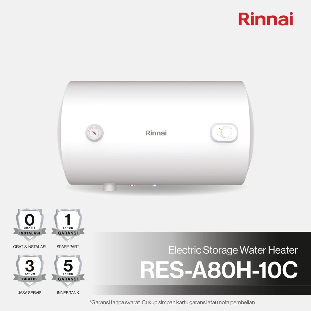 #SKU. RES A80H-10C Product description : WATER HEATER RINNAI RES A80H-10C ukuran 460 X 846 X 495 mm berat 23,5 Kg kapasitas 80 Liter tekanan air max 0,75 Bar daya listrik 1000 W voltase temperatur maksimum inner tank kapasitas penggunaan sensor kebocoran listrik elcb 220-240/50...