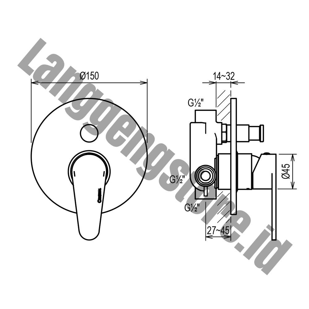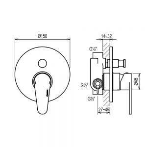 VISION T C33954 Concealed Bath Shower Mixer by Rino Crestial #SKU. C33954 Product description : VISION T C33954 Concealed Bath Shower Mixer Single lever concealed bath shower mixer ½” Ø40mm ceramic cartridge automatic diverter top and bottom outlets ½” with Ø150mm cover plate chrome finish Dimensional Drawing Product Range